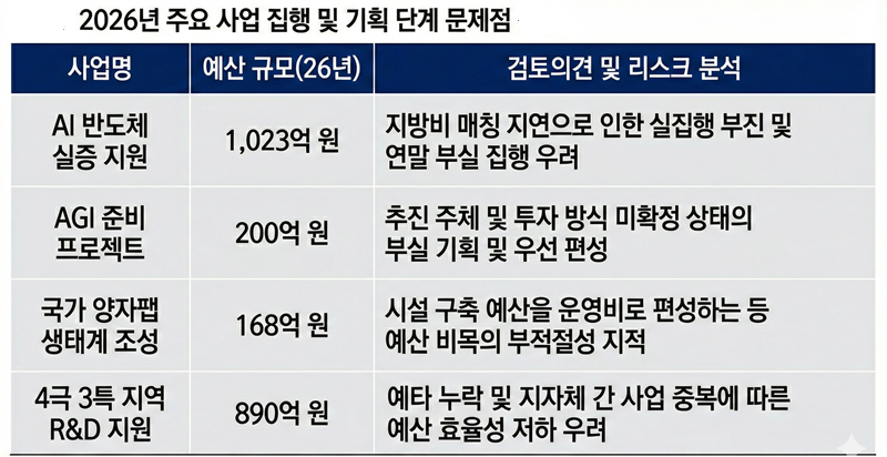 신규로 추진되는 대형 프로젝트들의 기획 부실도 도마 위에 올랐다. 200억원이 편성된 'AGI(인공 일반 지능, Artificial General Intelligence) 준비 프로젝트'는 국가 AGI 연구소의 법적 지위나 운영 방식, 민간 투자 유치 구조 등이 확정되지 않은 상태에서 예산이 먼저 배정된 대표적인 '선 예산, 후 계획' 사례다. 국회는 추진 주체조차 불명확한 사업에 거액의 세금을 투입하는 것은 재정 민주주의 원칙에 어긋난다고 지적했다.