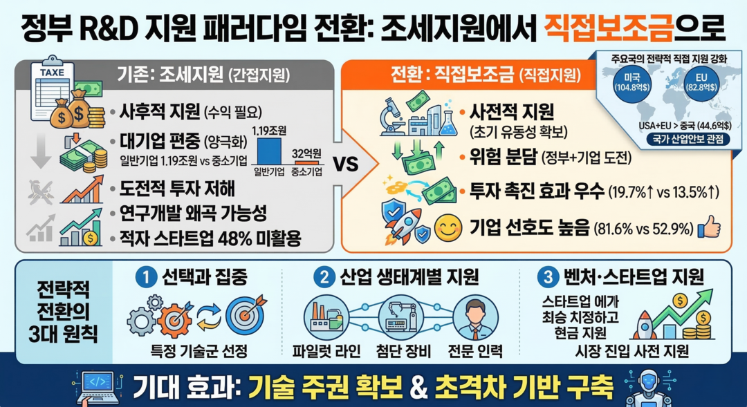 실증 연구 결과에 따르면, 직접 보조금이 조세지원보다 기업의 R&D 투자를 촉진하는 효과가 더 크다. 정부 R&D 재정지원을 받은 기업은 1년 후 R&D 투자가 평균 19.7% 증가한 반면, 조세지원 수혜 기업의 증가율은 13.5%에 그쳤다.