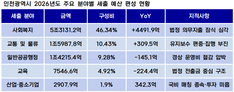예결신문 - [2026 인천시 예산 분석] ㊦ 5.3조 복지 ′최대′⸱⸱⸱인프라 투자 고작 2%