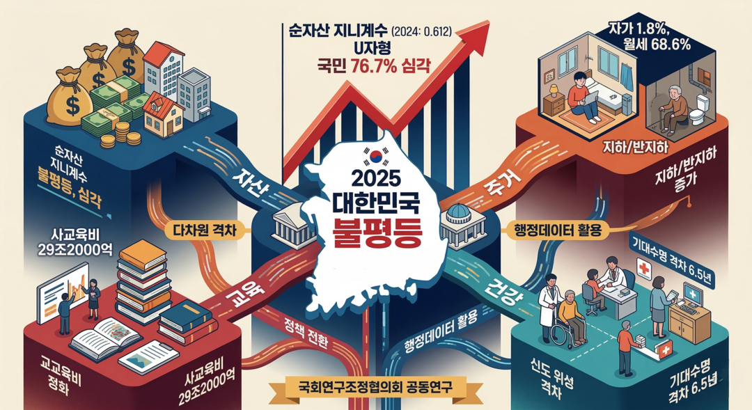 이는 부동산 가격 폭등과 자산 세습 영향력이 커지면서 소득만으로는 자산 격차를 극복하기 어려운 구조가 고착화됐다는 지표다. 국민 대다수인 76.7%가 자산 불평등을 심각하게 인식하고 있으며, 이는 OECD 회원국 중 최상위권 수준이다.