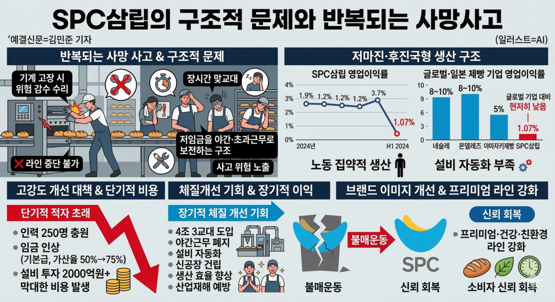 지난 5월 발생한 SPC 공장의 사망사고는 이 같은 구조를 여실히 드러냈다. 사고 이후 SPC삼립은 인력 250명 충원, 4조 3교대 도입, 야간근무 폐지, 설비 자동화와 신공장 건립 등 강도 높은 대책을 발표했다.