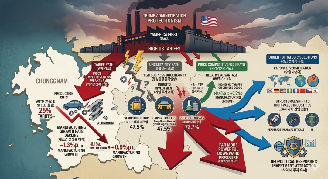 이번 분석 결과는 트럼프 1기 행정부 당시 충남 GRDP에 미친 영향(-0.1%p)과 비교했을 때 하방 압력이 훨씬 강력해졌음을 시사한다. 보호무역주의 기조가 장기화될 경우 제조업 기반 자체가 약화될 수 있는 만큼, 수출 포트폴리오 다각화와 함께 탄소중립 등 글로벌 수요가 확대되는 유망 산업으로의 역량 집중이 그 어느 때보다 필요한 시점이다.