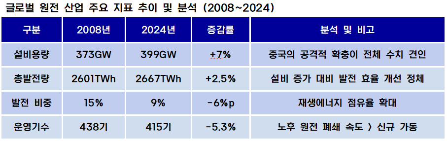 중국을 제외한 나머지 지역의 지표를 보면 원전 설비용량은 365GW에서 342GW로 6% 감소했고, 발전량 역시 2536TWh에서 2250TWh로 11% 줄었다. 독일의 탈원전 선언과 대만의 단계적 폐쇄 정책뿐만 아니라, 프랑스 등 전통적 원전 강국들조차 설비 노후화와 유지보수 비용 상승으로 고전하고 있다.