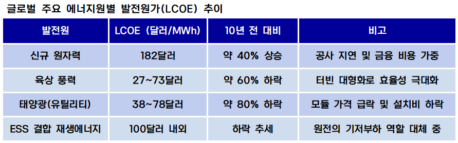 원전은 설계부터 완공까지 통상 10년 이상의 기간이 소요되며 이 과정에서 발생하는 막대한 금융 비용과 강화된 안전 규제에 따른 설계 변경 비용이 발전원가에 고스란히 반영된다. 반면 재생에너지는 기술 혁신과 대량 생산으로 매년 단가가 하락하고 있다.