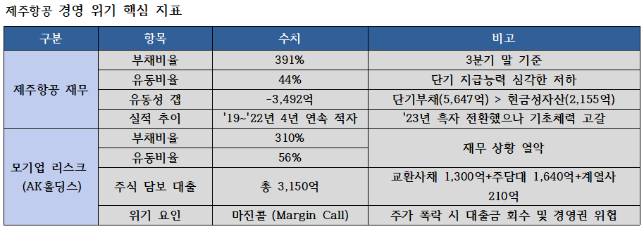 문제는 이번 참사로 제주항공의 주가가 폭락할 경우, 담보 가치 하락에 따른 금융권의 상환 압박(마진콜)이 시작된다는 점이다. 주가가 일정 수준 이하로 떨어지면 채권단은 대출금을 즉시 회수하거나 담보로 잡은 주식을 강제로 처분하게 된다. 이는 AK홀딩스의 유동성 위기는 물론, 그룹 경영권 상실로까지 이어질 수 있는 최악의 시나리오다.