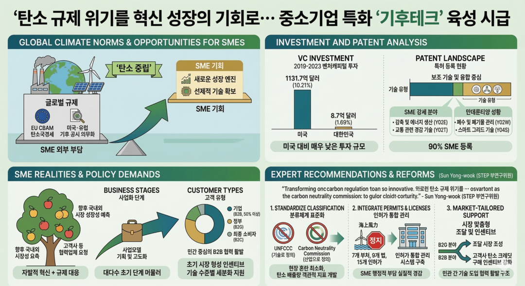 기후테크 중소기업 육성을 위한 핵심 과제로는 가장 먼저 모호한 개념과 분류체계의 표준화가 꼽힌다. 현재 유엔기후변화협약(UNFCCC)은 기후테크를 '기술'로 정의하는 반면 2050 탄소중립녹색성장위원회는 '산업'으로 정의하는 등 기관별로 이해관계가 상이해 현장의 혼란이 가중되고 있다.