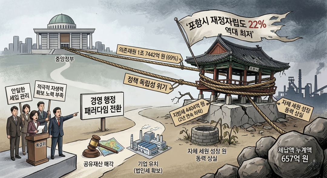 [예결신문=김대성 기자] 포항시의 2024년도 총 세입액은 3조355억원으로 집계됐다. 전년 2조9805억원 대비 1.85% 증가했으나 실질 지표가 추락, 시 재정 건전성에 심각한 경고등이 켜졌다. 특히 2024년 결산 기준 재정자립도는 22.0%를 기록, 최근 5년 중 가장 낮은 수치를 기록했다. 이는 유형평균의 30.8%와 비교해도 8.8%p나 낮은 수준이다.
