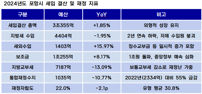 전체 세입에서 지방세가 차지하는 비중 또한 2022년 15.68%에서 2024년 14.51%로 쪼그라들었다. 철강 경기 둔화로 인한 법인 지방소득세 감소와 부동산 시장 한파로 인한 취득세 정체가 복합적으로 작용한 결과다.
