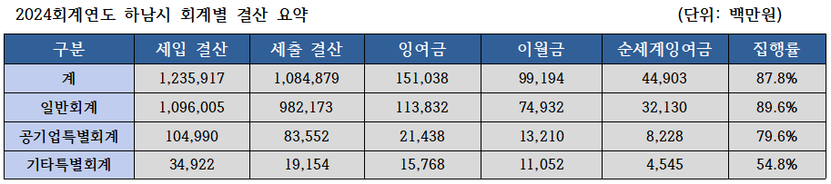 하남시 결산서에 따르면 2024년 회계별 세입·세출 집행 현황은 다음과 같다.