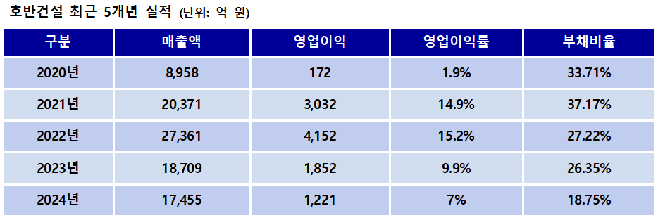 2024년 총매출(17.5조원) 중 부문별 매출 비중은 '공사' 73.5%, '분양' 25.7%, '용역·임대' 0.8%으로 도급공사 비중이 압도적이지만 '(주택)분양' 이익(1143억)이 전체(2054억)의 56%를 차지한다.