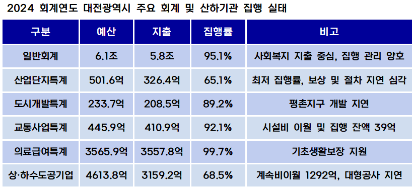[예결신문=김대성•김민준 기자] 대전광역시의 2024 회계연도 세출 결산 결과, 예산현액 대비 집행률은 93.1%를 기록했다. 외형상 양호한 수치이나, 세부적으로 들여다보면 행정의 적시성과 집행 역량 측면에서 미숙함이 발견된다.