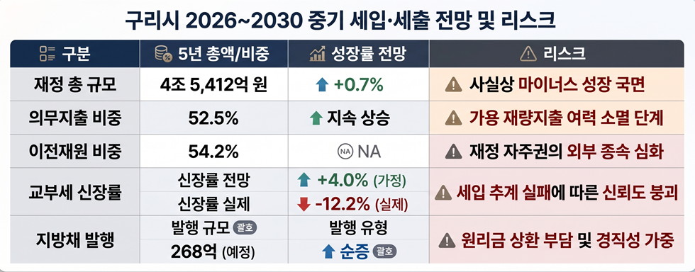 [예결신문=김대성 기자] 구리시가 수립한 '2026~2030년 중기지방재정계획'의 총규모는 5년간 4조5412억원으로 확정됐다. 하지만 그 이면에는 연평균 증가율 0.7%라는 초라한 성적표가 숨어 있다. 물가 상승률을 감안하면 사실상 재정 규모가 정체되거나 축소되는 국면인 셈이다.