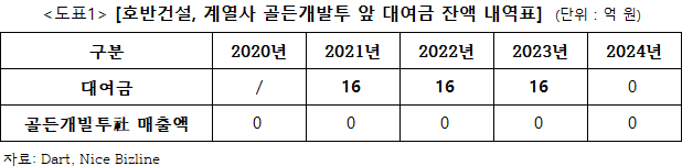 그럼에도 호반건설은 이 회사 설립 이듬해인 2021년에 어떠한 안전장치도 없이 골든개발투 앞으로 약 16억원을 대여한 후, 그로부터 3년이 지난 2024년 아예 대손상각(손실) 처리했다.