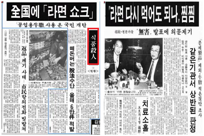 그럼에도 언론들은 ‘공업용=유해’라는 등식으로 “삼양라면은 비누 기름 라면”이라는 비과학적 고집을 꺾지 않았다.