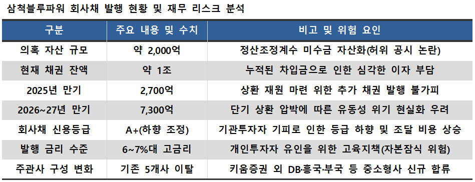 삼척블루파워의 재무 구조는 이미 레드라인을 넘어서고 있다. 총사업비 약 5조원 중 상당 부분을 회사채 발행으로 충당해 왔는데 현재 남은 채권 잔액만 1조원에 달한다. 당장 올해 2700억원을 시작으로 내년과 내후년까지 1조원에 육박하는 만기가 줄줄이 대기 중이다.