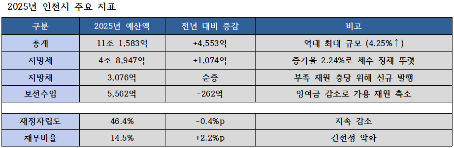 [예결신문=김지수 기자] 인천시가 2025년도 일반회계 예산 규모를 사상 처음으로 11조원대로 확정하며 외형적 성장을 선언했다. 작년 대비 4553억원(4.25%) 증가한 11조1583억원 규모다. 그러나 그 이면에는 부동산 경기 침체로 인한 세수 부족과 급격히 악화되는 재정 지표들이 드리워 있다. 재정자립도는 뒷걸음질 치고 채무비율은 치솟는 상황에서 시의회는 빚에 의존하기보다 중앙정부를 설득해 국비를 확보하는 '세일즈 행정'에 총력을 기울일 것을 강력히 주문했다.
