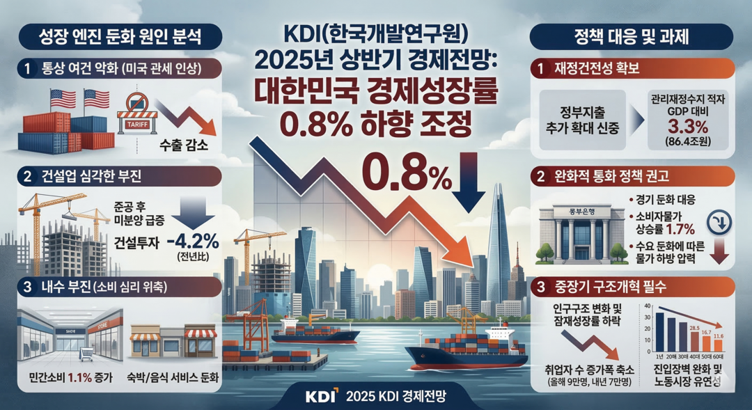 [예결신문=신하연 기자] KDI(한국개발연구원)가 2025년 상반기 경제전망을 통해 올해 우리나라의 경제성장률을 0.8%로 대폭 하향 조정했다. 이는 건설업의 심각한 부진과 더불어 미국 관세 인상 등 통상 여건이 급격히 악화된 결과로 분석된다. 올 1분기 국내총생산(GDP)은 전년 동기 대비 0.1% 감소하며 역성장을 기록했으며 계절조정 전기 대비로도 0.2% 감소하며 4분기 연속 정체되는 모습을 보였다.