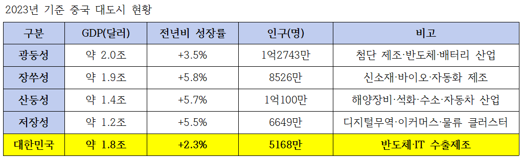 • 광둥·장쑤·산둥·저장 등 톱티어 성은 GDP와 인구에서 국가급 체급으로, 지방–지방 직통 라인의 경제 파급력이 크다.