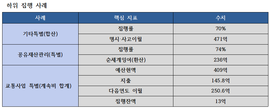 실제 사례로 교통사업 특별회계 '계속비' 합계를 보면, 지출 146억원에 그쳤고 다음연도 이월 250억원이 발생했다. 이는 '연차공정 미도래 → 연내 집행 미달 → 이월'의 전형이다. 반대로 복지·경상성 사업(예: 의료급여 99%, 수질개선 95%)은 수요 예측이 가능해 불용·이월이 상대적으로 작다. 자산 취득·인프라·공사형 사업에서 일정 리스크가 커지고 있다.