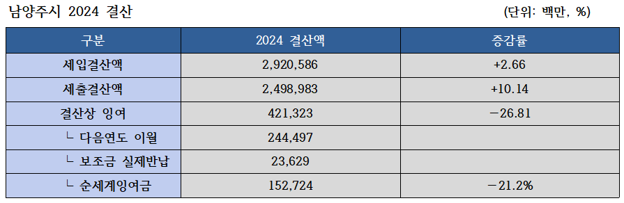 [예결신문=김지수⸱백도현 기자] 남양주시 2024회계연도 결산 총괄은 세입 2조9206억원(yoy +2.66%), 세출 2조4990억원(yoy 10.14%), 잉여 4213억원이다. 잉여는 다음연도 이월 2445억원, 금 실제반납 23,629백만 원, 순세계잉여금 1527억원으로 처리됐다. 회계별 집행률은 일반 88%에 비해 특별 73%·공기업 76%로 저조했다.