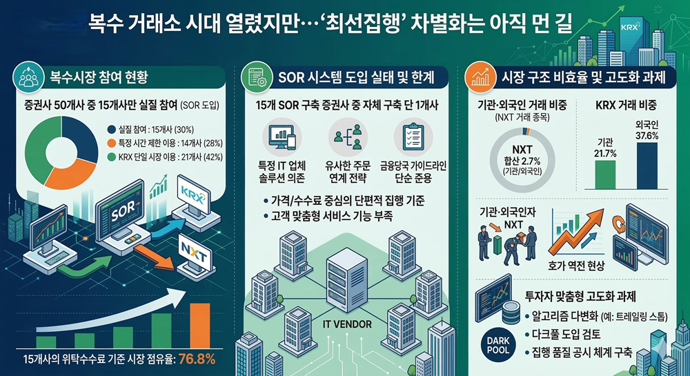 나머지 증권사 중 14개사는 프리마켓이나 애프터마켓 등 특정 시간대에만 제한적으로 NXT를 이용하고 있으며 21개사는 여전히 KRX 단일 시장만을 이용하는 전통적 방식을 유지하고 있다. 특히 SOR 시스템을 갖춘 15개 증권사 중에서도 자체적으로 시스템을 구축한 곳은 단 1개사에 불과하며, 대다수는 특정 IT 업체의 솔루션에 의존하고 있어 증권사 간 주문 연계 전략이 유사한 구조를 띠고 있다.
