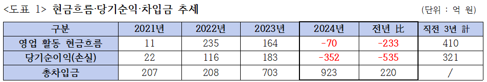 특히, 대여금 <대손상각비>로 떨어낸 비용이 직전년 2023년 0원→ 작년 209억원으로 폭등했고 같은 기간 <투자 주식 손상차손>도 7억원→ 98억원으로 1년 만에 91억원이 급증, 2개 항목에서 직전년 대비 300억원 이상 급증한 것이 주요인으로 분석됐다(도표 2).