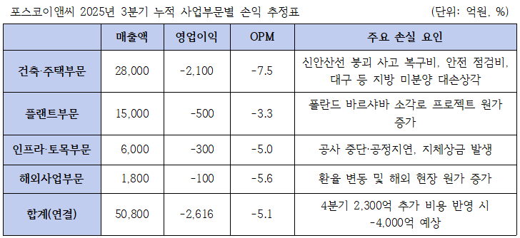 28일 포스코이앤씨 2025년 3분기 잠정실적에 따르면 회사는 올 3분기 1947억원의 영업손실을 기록했다. 3분기 누적 손실은 2616억원, 당기순손실은 2709억원으로 확대됐다