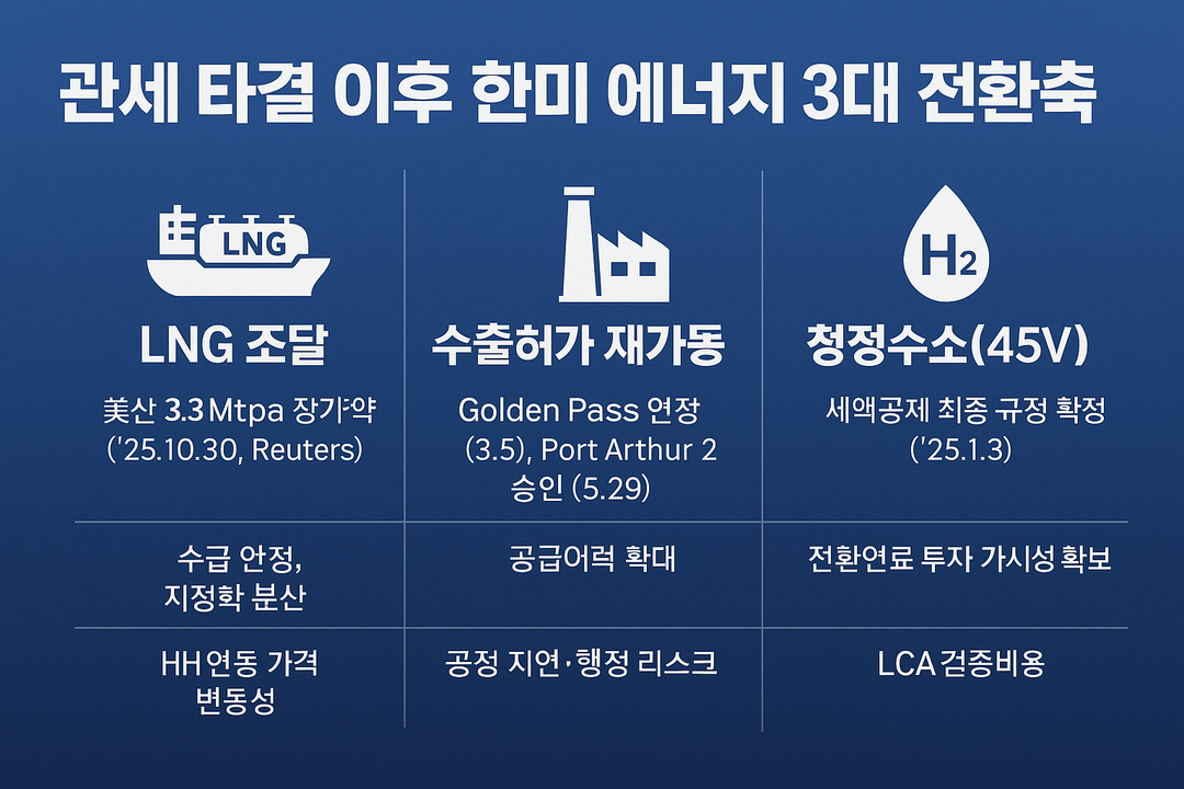 이를 종합하면 한국 에너지산업은 관세 타결로 교역의 문을 활짝 열었다면 LNG 계약과 45V 확정은 안정적 공급과 탈탄소 전환으로 이어지게 만든 결정적 계기가 됐다.