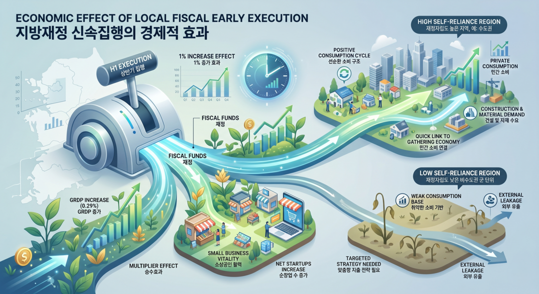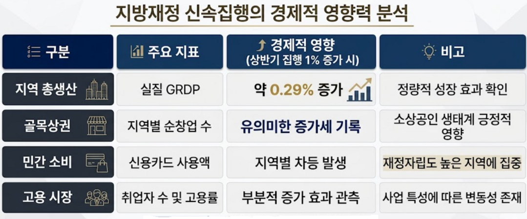 전국 지자체의 분기별 집행 데이터와 거시 경제 지표를 연계 분석한 결과, 상반기 재정 집행액이 1% 증가할 때 해당 지역의 실질 GRDP는 약 0.29% 증가하는 결과를 나타냈다.