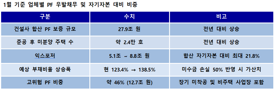 증권가에서는 준공 후 단기간 내 회수가 어려울 것으로 추정되는 미수금 익스포저는 5.1조원에서 8.8조원에 달하는 것으로 본다. 이는 분석 대상 건설사들의 합산 자기자본 대비 최대 21.8%에 이르는 규모다.