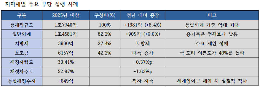 • '25년 예산, 전년 대비 8.44% 증가한 1조7746억⸱⸱⸱지방세 수입 정체, 국·도비 의존도 42% 돌파로 재정 구조 불균형 심각