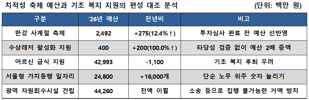 환경수자원위원회 심사보고서에 따르면, '한강 사계절 축제' 예산은 전년 대비 12.4% 증가한 24억9200만원이 편성됐다. 반면 어르신 급식 지원 사업은 현장의 식단가 인상 요구를 외면한 채 수립됐다. 이는 시장의 치적을 위한 전시성 사업에는 법적 절차마저 건너뛰며 관대한 반면, 약자의 생존권에는 가혹한 잣대를 들이대는 행정의 이중성을 그대로 보여주는 대목이다.
