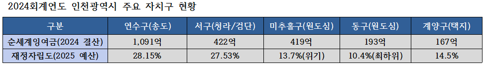 인천 예산 규모 1위(약 1조4500억원)를 자랑하는 서구(청라·검단)조차 잉여금 규모에서는 연수구의 상대가 되지 못했다. 서구의 순세계잉여금은 422억원에 머물렀다. 연수구(1091억원)의 40% 수준에 불과하다.