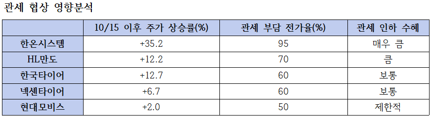 특히 현대차(+15.4%), 기아(+11.6%), 한온시스템(+35.2%) 등 주요 종목이 관세 타결 '기대감'에 급등했으며 이는 실적 개선보다 '기대 선반영' 성격이 강하다는 평가다.