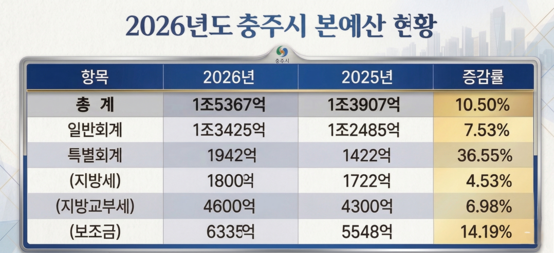 [예결신문=김대성 기자] 충주시의 2026년도 본예산 총규모는 1조5367억원으로 확정됐다. 이는 전년도 예산액인 1조3907억원 대비 1460억원(10.50%) 증가한 수치다. 하지만 자체 수입인 지방세와 세외수입의 비중이 낮고 지방교부세와 보조금 등 의존재원에 기댄 취약한 재정 구조가 지속되고 있는 것으로 나타났다.