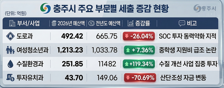 4일 예결신문이 충주시의 2026년도 예산서를 분석한 결과 시 건설국 소관 예산은 715억원으로 전년(888억원) 대비 19.48% 감소했다. 구체적으로 도로과 예산은 492억원으로 26.04%나 급감했다. 주요 SOC 사업인 살미 향산(군도5호선) 도로 개설은 4억원이 편성됐으나, 추진이 지연되고 있다.