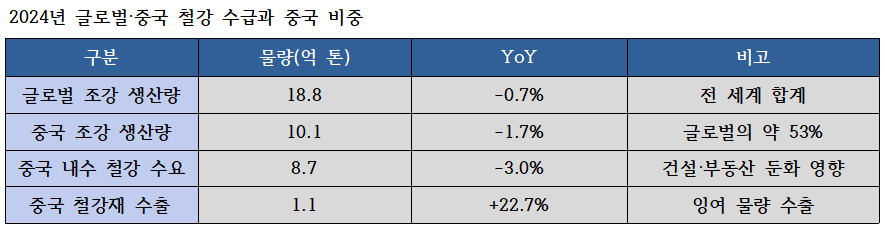 중국 내 건설·부동산 경기 둔화가 수요를 짓누르자, 남는 물량이 동아시아 인근 시장으로 밀려나오고 있고 그 직격탄이 한국과 일본으로 향했다. 작년 한국의 중국산 철강재 수입은 880만 톤으로 전년보다 1% 증가한 반면, 일본산 수입은 473만 톤으로 16% 감소했다. 값싼 중국산이 일본산을 상당 부분 대체한 것이다.
