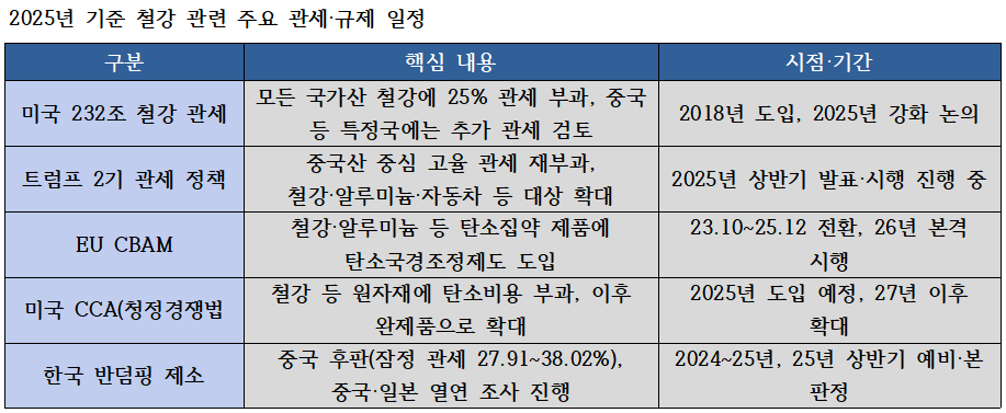 • 미국 232조·트럼프 2기 고율 관세, EU CBAM·미국 CCA 등 통상·탈탄소 규제가 겹쳐 철강 가격은 지역·규제에 따라 갈라지는 구조가 굳어지고 있다.