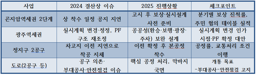 송정지구 2공구는 민간 차고지 이전 지연이 발생해 이전 확정 이후에야 본공정이 열렸다. 교통 처리(우회전·보행) 조건 이행은 당분간 현장의 핵심 변수다. 성남~광주 지방도 확·포장(2공구) 등 도로사업은 공구 간 의존성과 교량·부대공정이 얽혀 공정 관리 난도가 높았고 개통 이후의 노선·환승체계 조정까지 감안하면 행정·정치권의 세밀한 조율이 불가피하다.